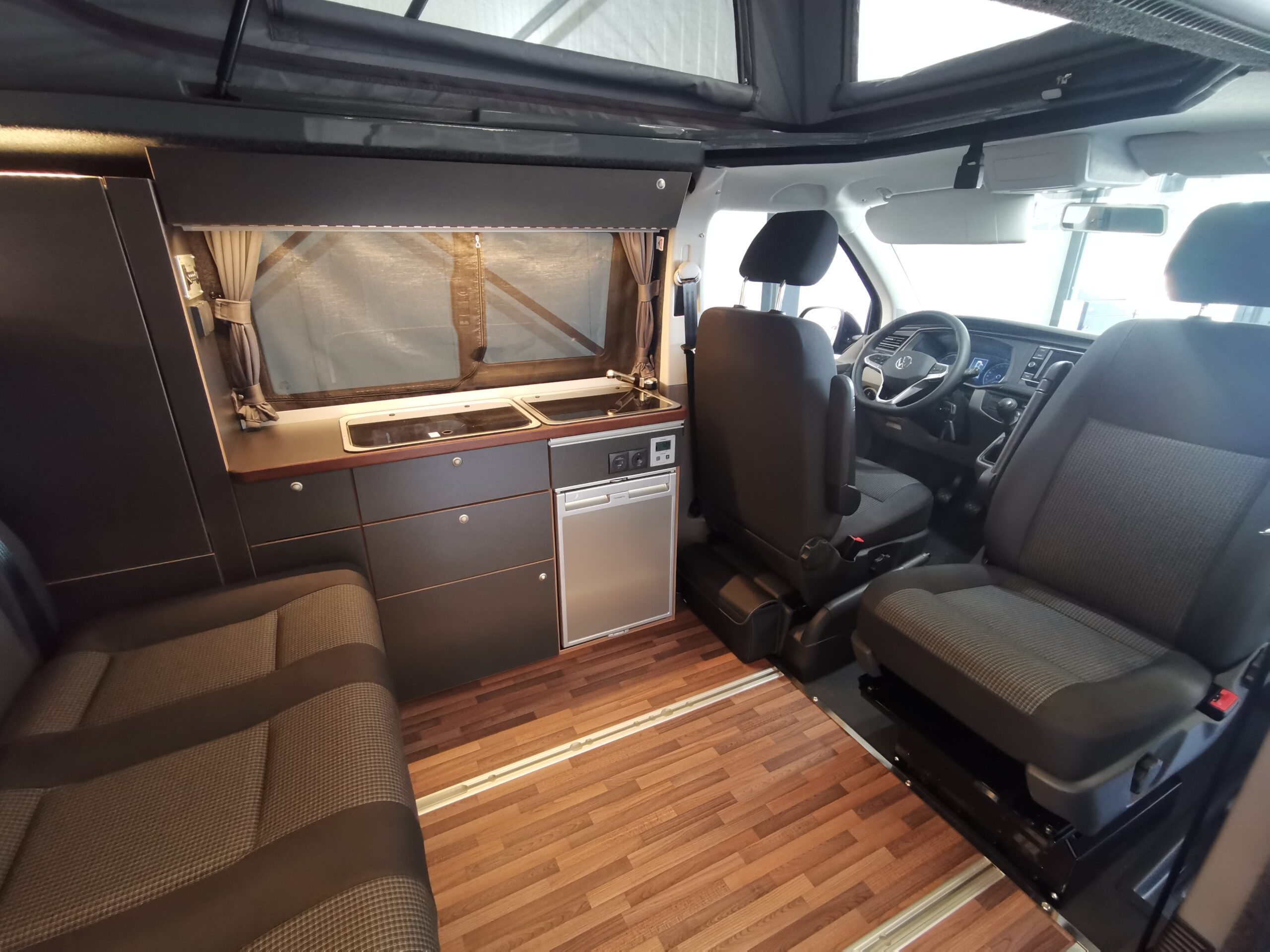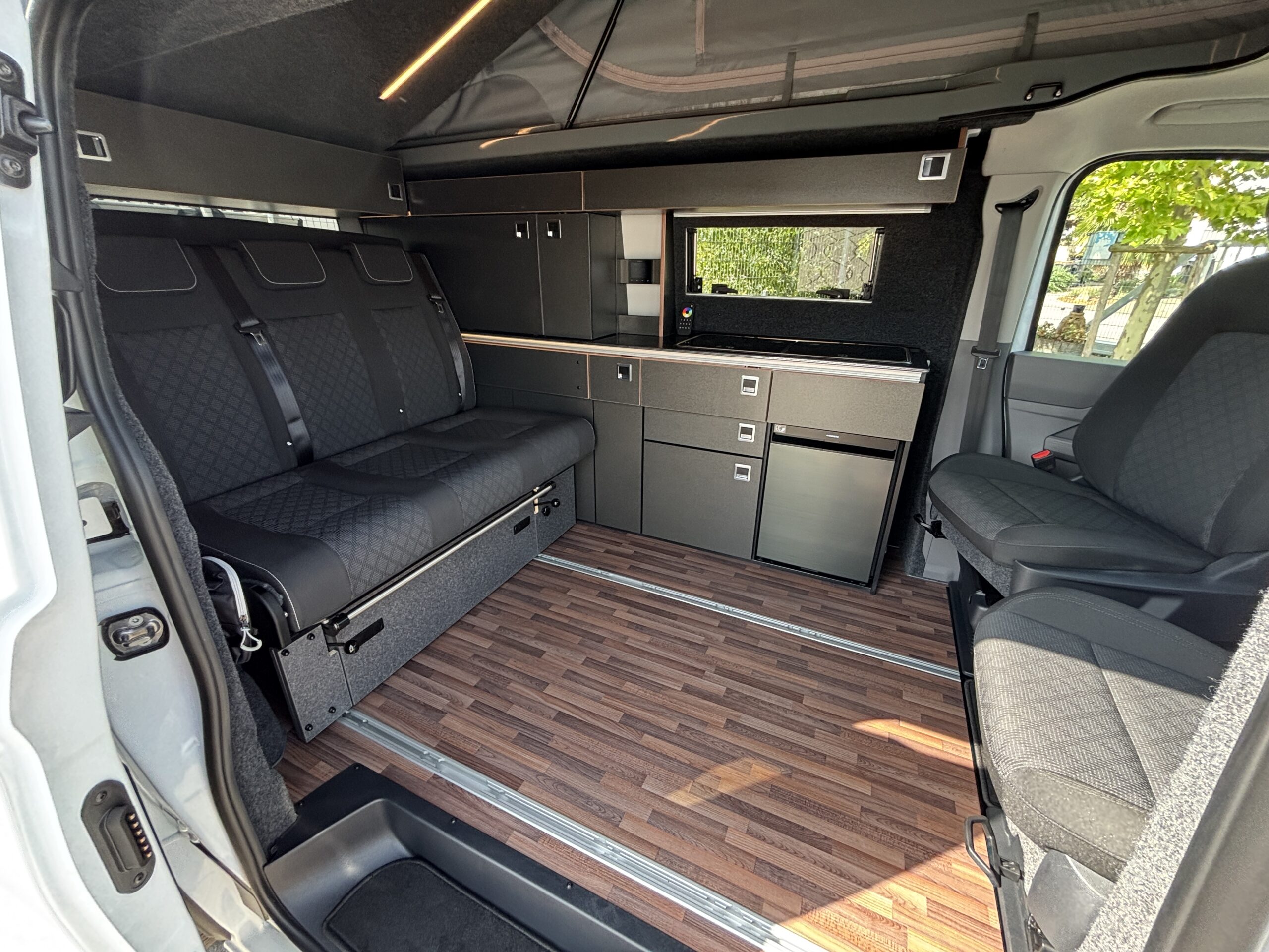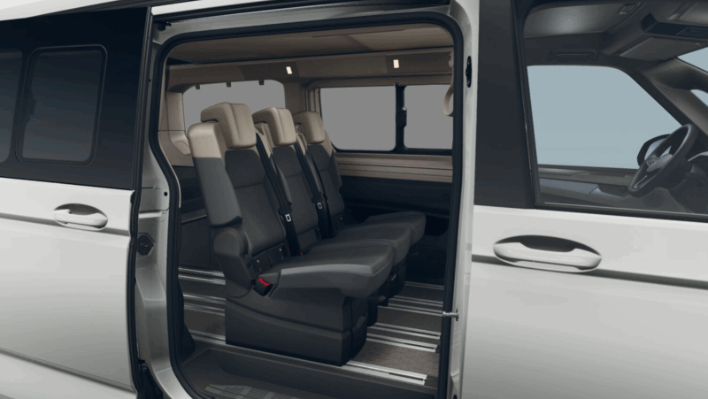 Die Dreiersitzbank ermöglicht fünf eingetragene Sitzplätze inklusive Isofix und verstellbaren Rückenlehnen. Die Fahrersitze sind vollständig drehbar wie vom T6.1 gewohnt und damit genießen Sie höchste Flexibilität bei Sitz- und Schlafkonfigurationen – perfekt für Paare, Alleinreisende oder Familien.