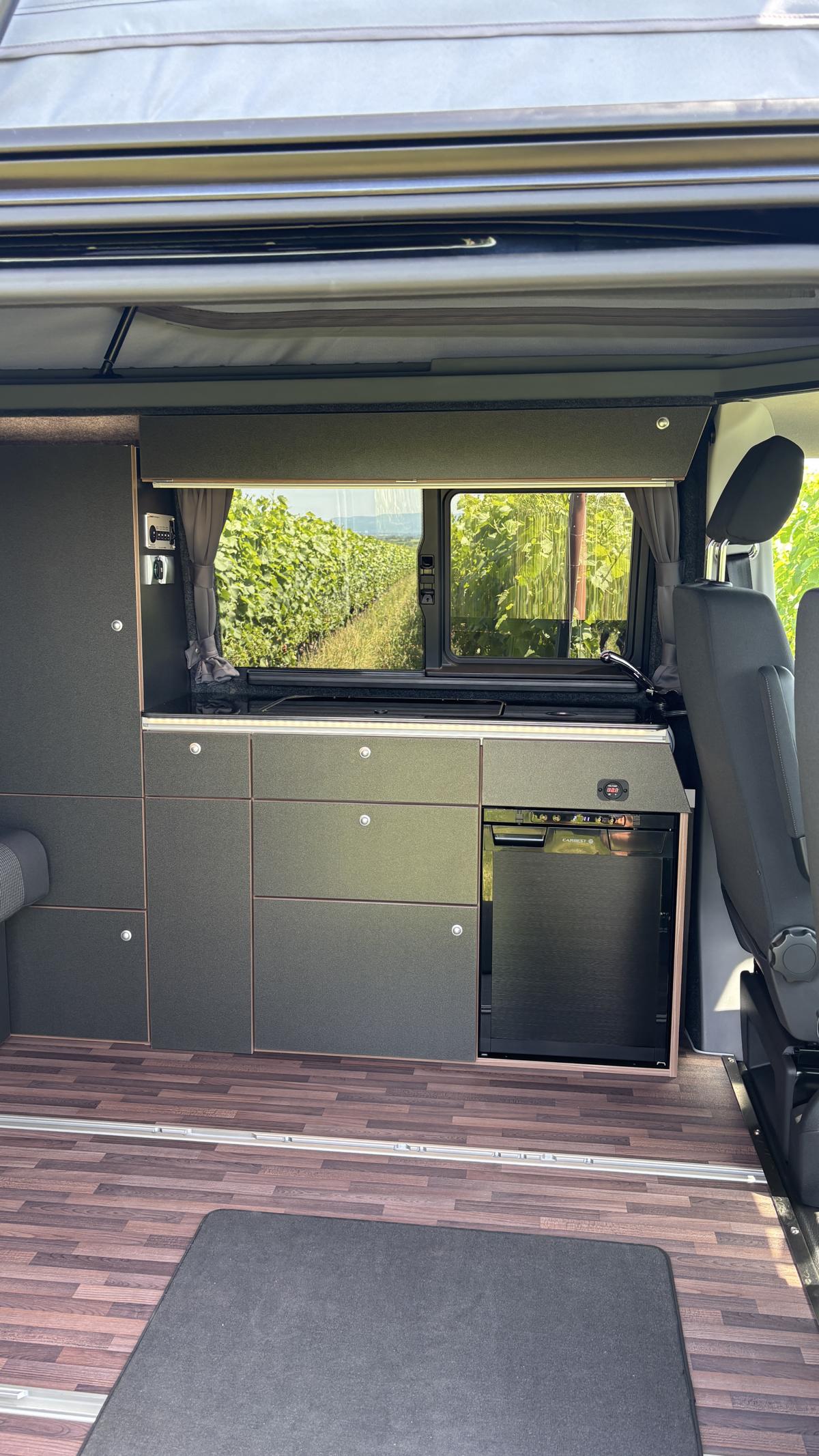 Der WSR Campervan T7 bietet eine durchdachte Küche mit fest eingebautem Dometic Kompressorkühlschrank, Induktionskochfeld sowie mobilem Gaskartuschenkocher – der sorgt auch als Grill für maximale Unabhängigkeit unterwegs. Optional lässt sich ein zweiflammiger Gaskocher mit 5-kg-Gasflasche integrieren – perfekt für autarkes Kochen im Outdoor-Urlaub.