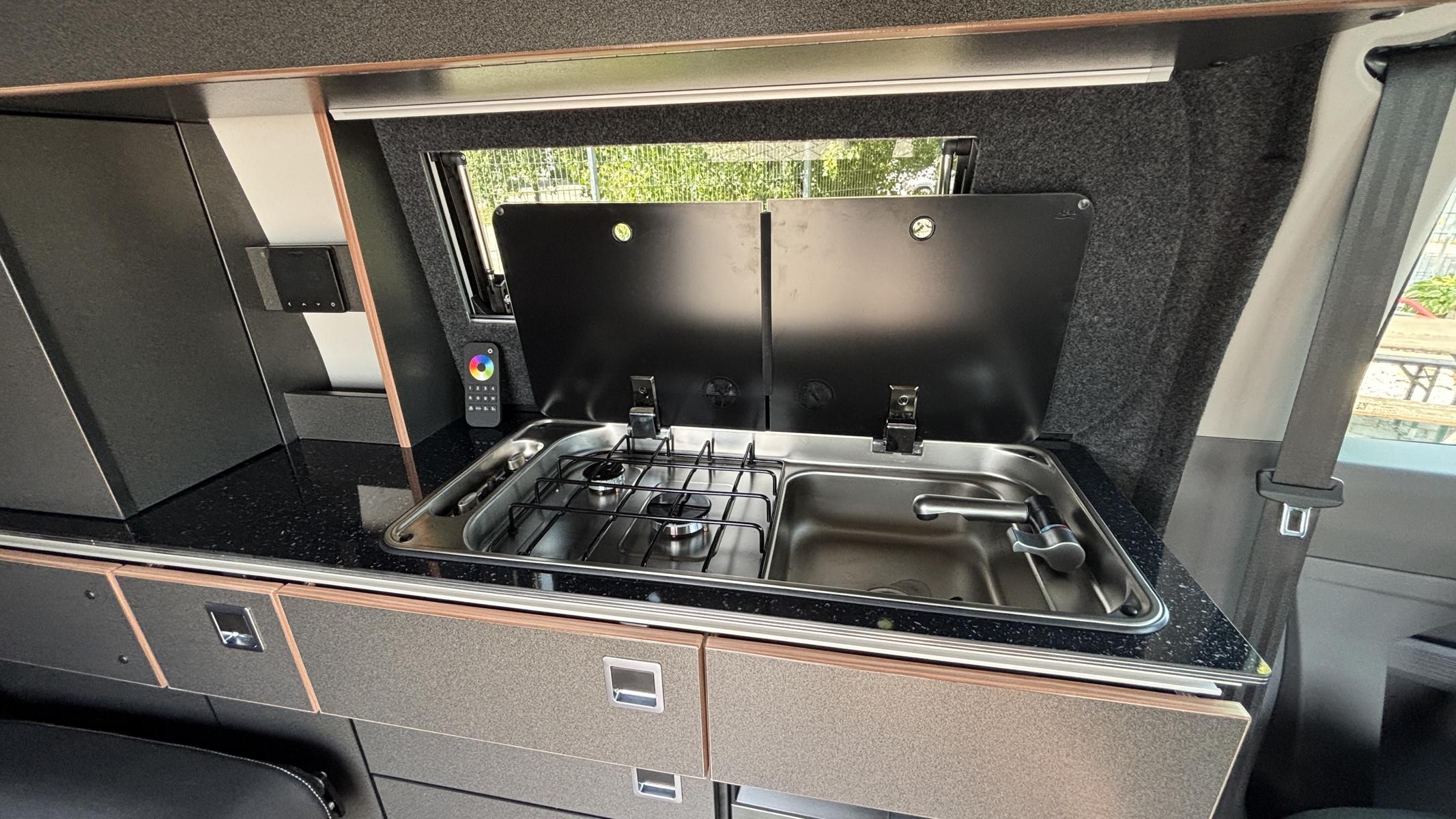 Spüle und 2-Flamm-Kocher von CAN mit Glasabdeckung – integriert in eine robuste, moderne Glas-Metall-Arbeitsplatte